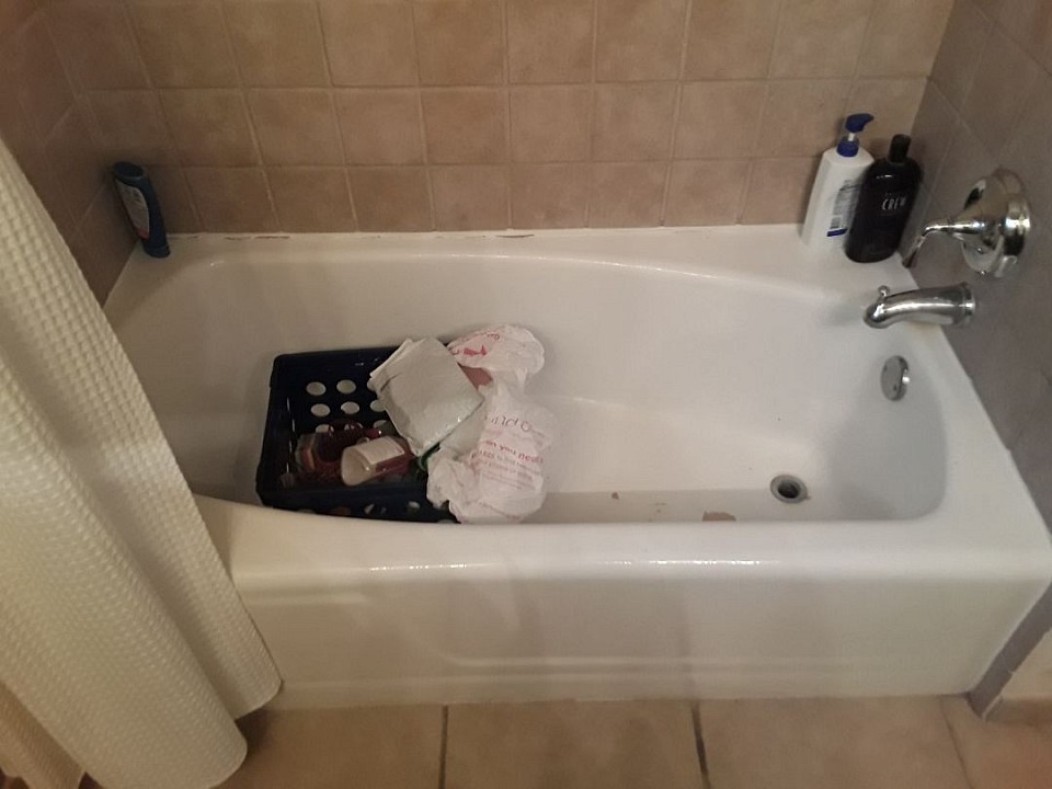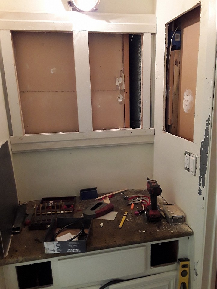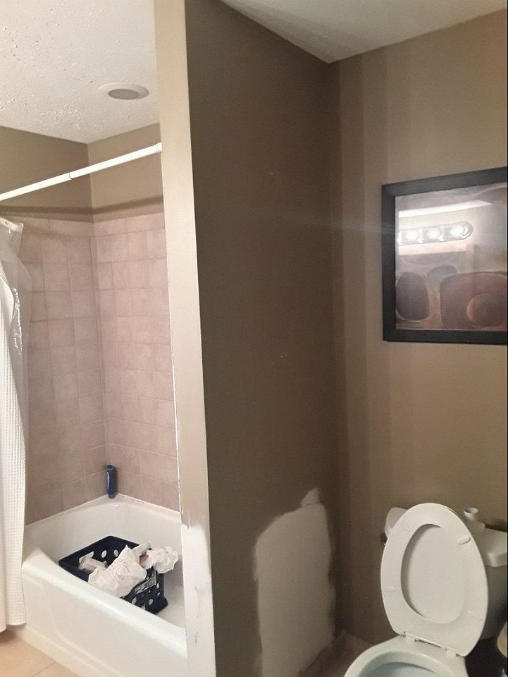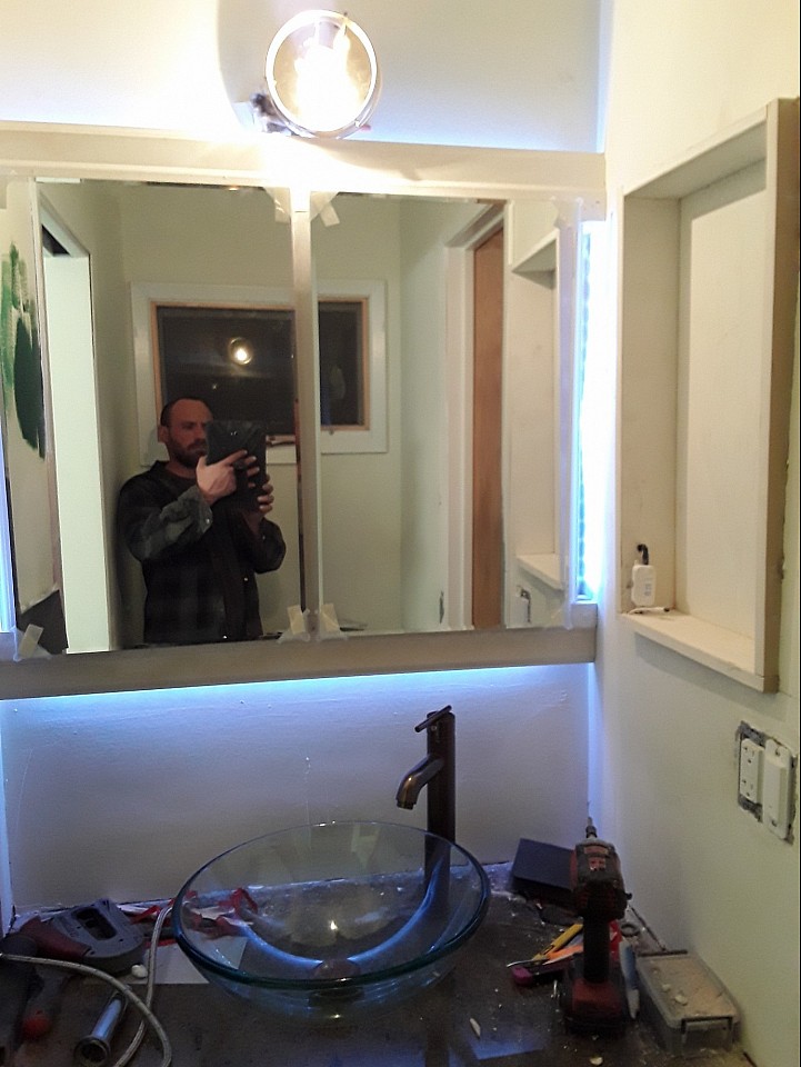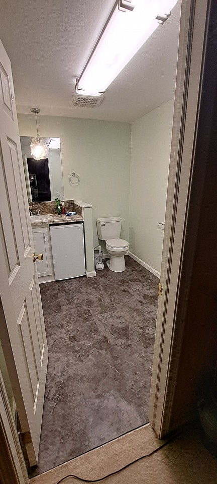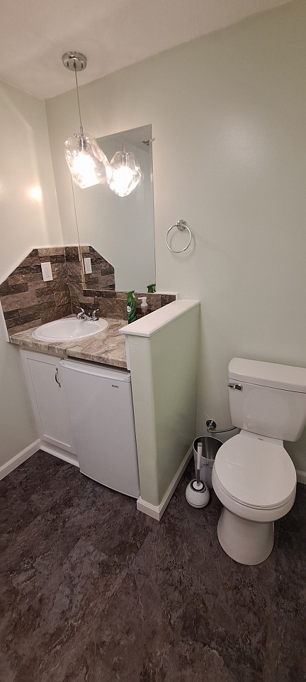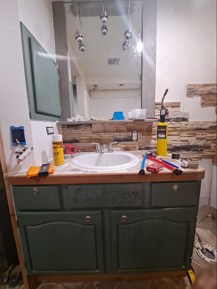 Picture makes it look nicer than it was. Sink and vanity aren't attached to anything. plumbing backs up. Floor drain drops 6" down in middle of floor. mold around bottom of walls. single pain window I cracked. Has no ventilation. Very cold and uncomfortable space made very cozy.