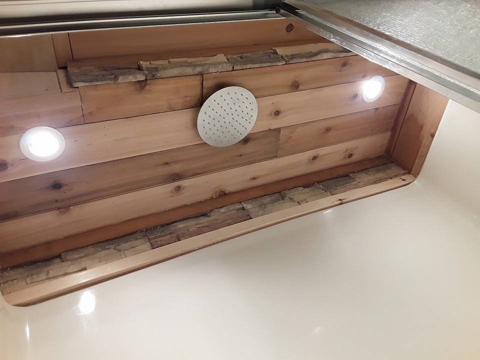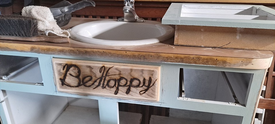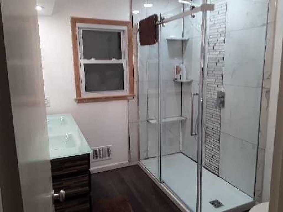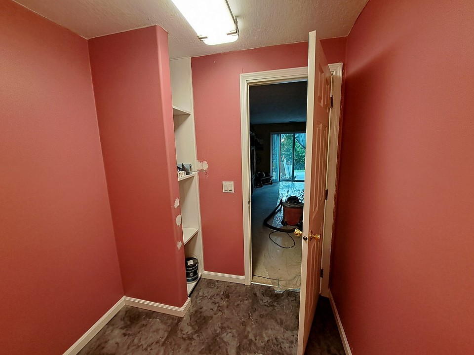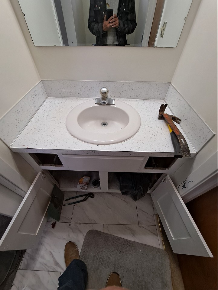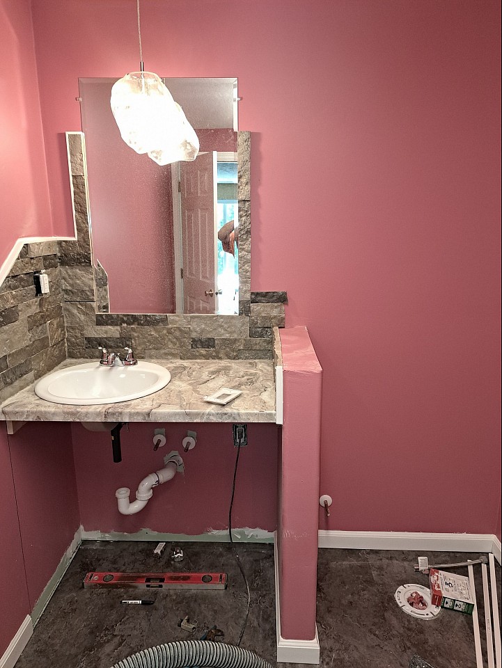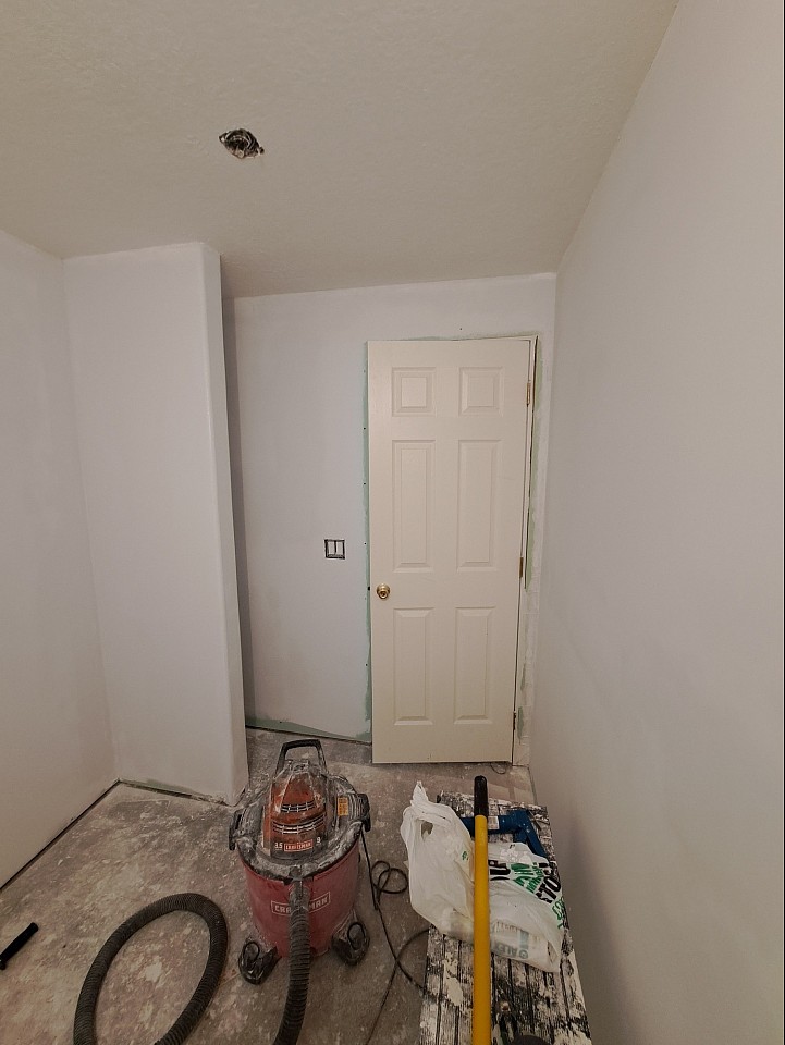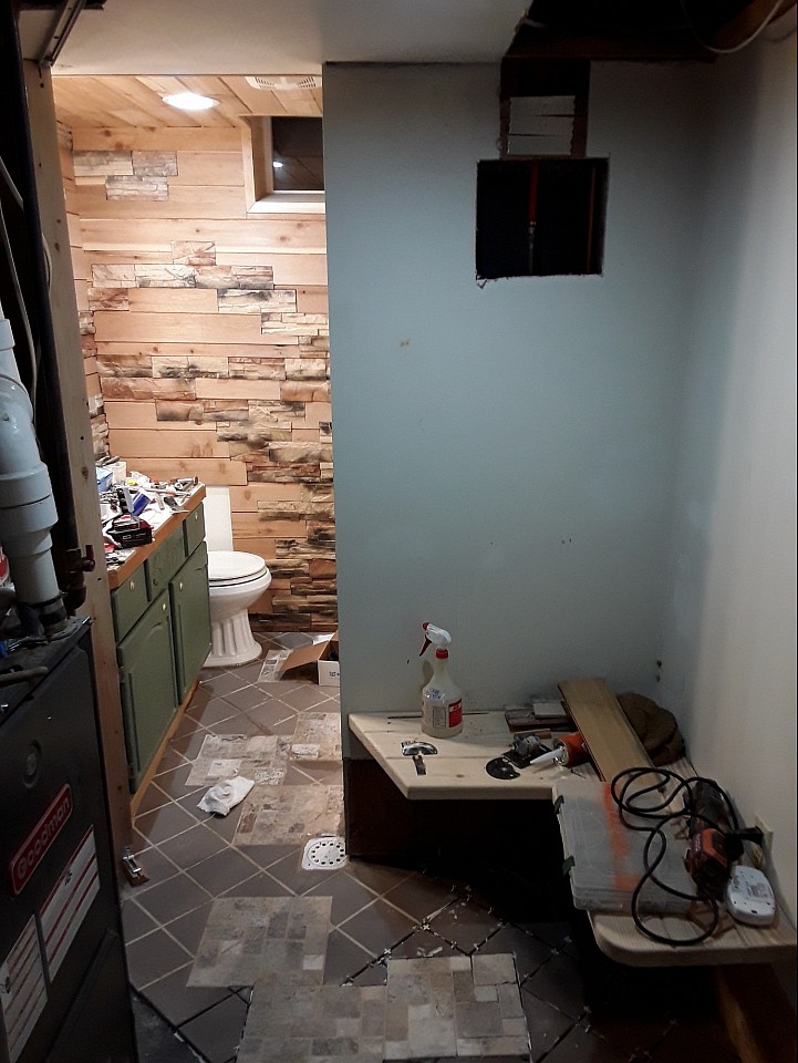 Couple had roughed in plumbing in there basement already but need it put together. His insolent was kept in a small fridge in the area. So, I built it into the vanity for him. added LED lighting, and a smart moisture sensing exhaust fan. Custom shelving for storage and a dark stone LVP flooring. The original color they chose was a little much, so I gladly repainted it a much more neutral color for them.