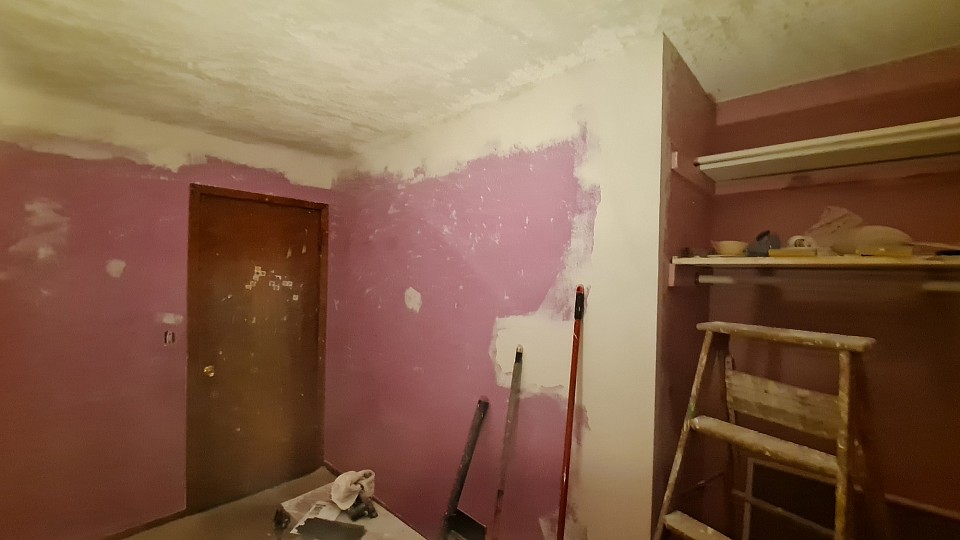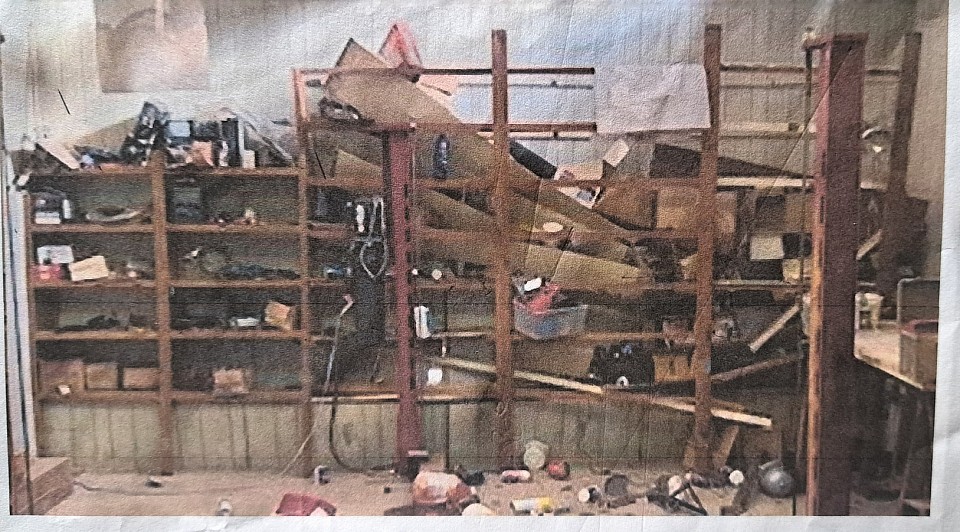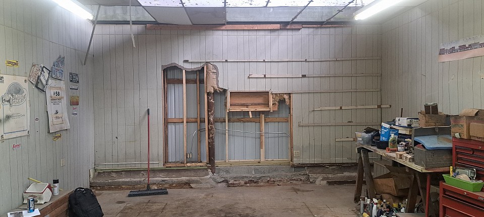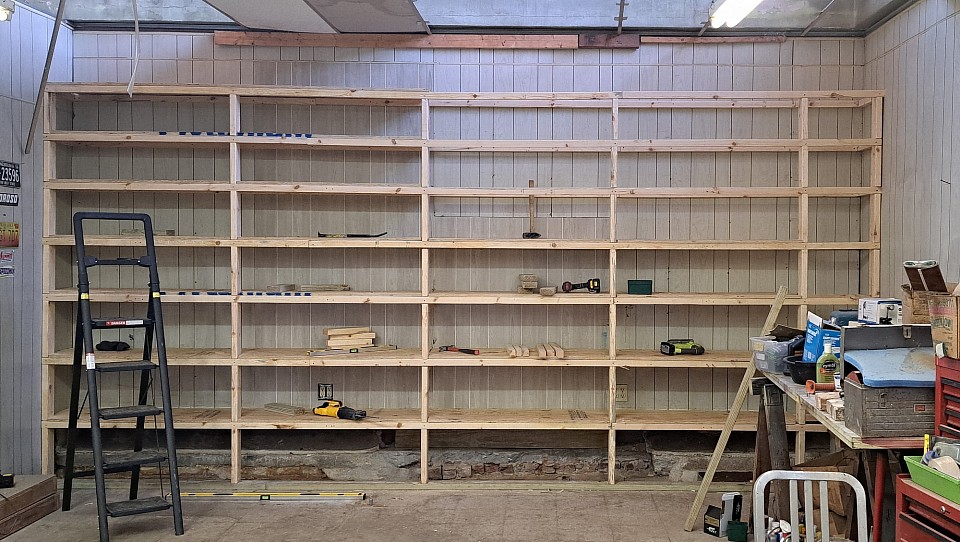 Car ran into the side of a commercial building. On the other side of the wall was a hobby garage with a wall of shelving. When we arrived, they had already removed the shelving and everything that was on them. We repaired the wall and built a new set of shelves.