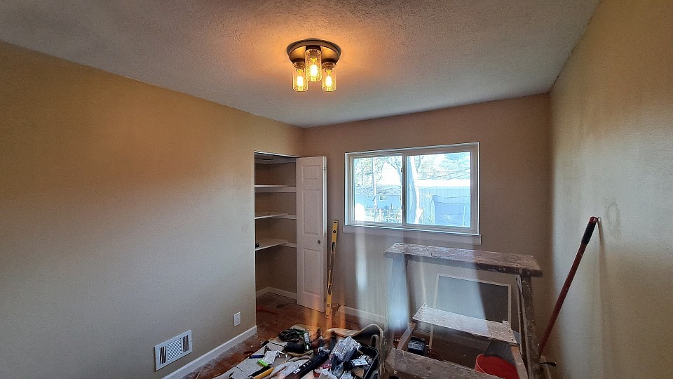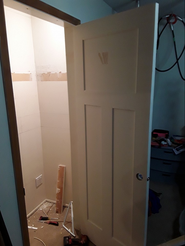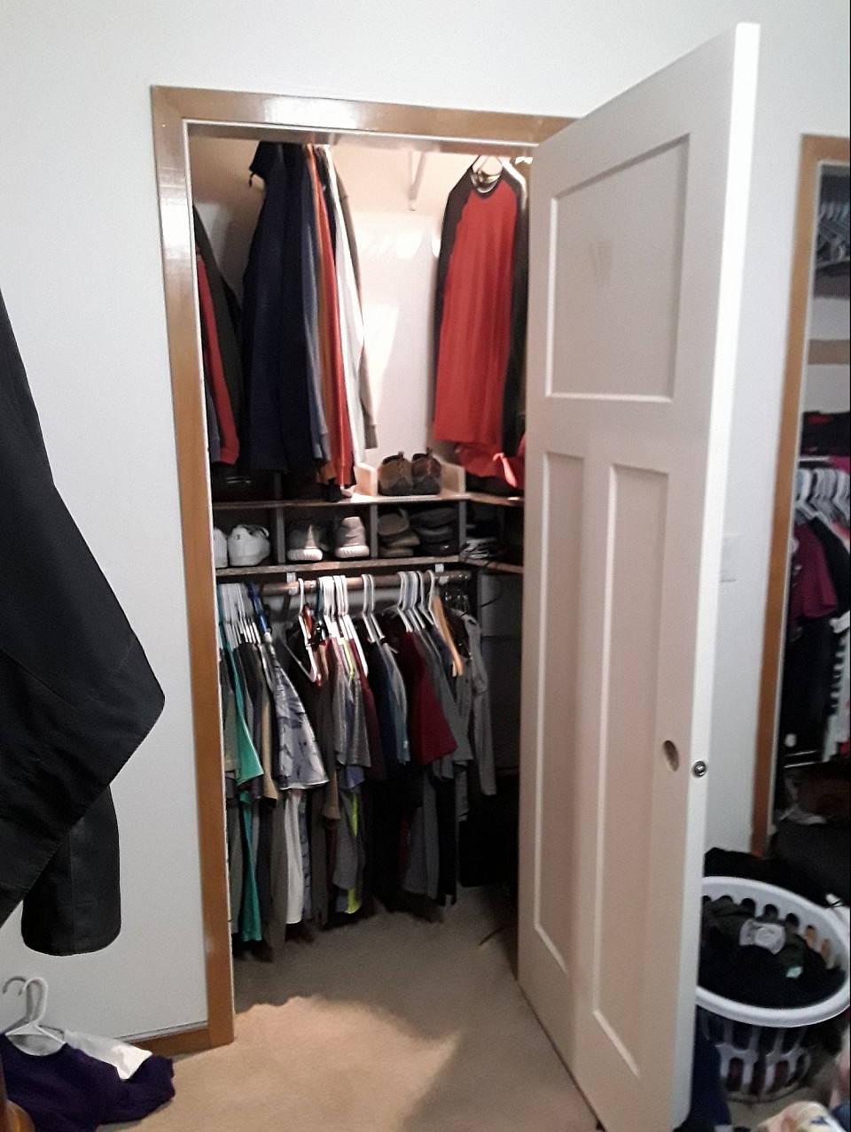 this smaller closet is only 5' wide, but it does have 8' ceiling so i went ahead and split it into two racks with a shoe holder that rapes around the inside. plus adding lighting, outlet for charging, row of drawers on the bottom right, and replacing the broken bi-fold door with a nice three panel.